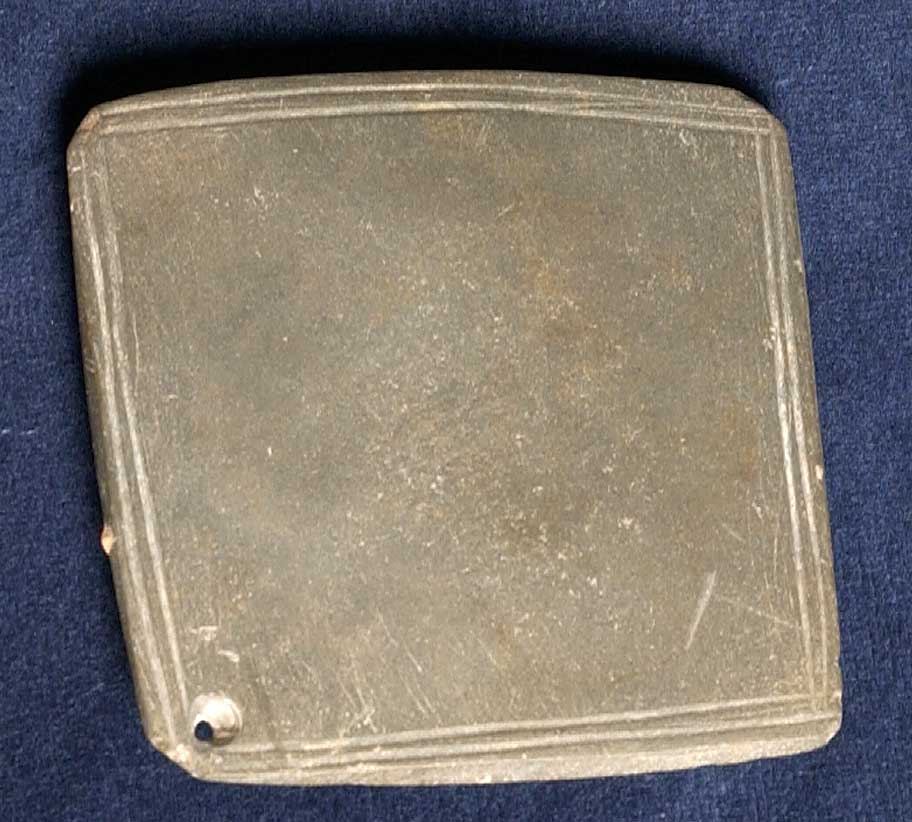 Roughly square cosmetic palette with pierced hole at one corner and double parallel lines incised round edge on one side. Petrie, type 96U.