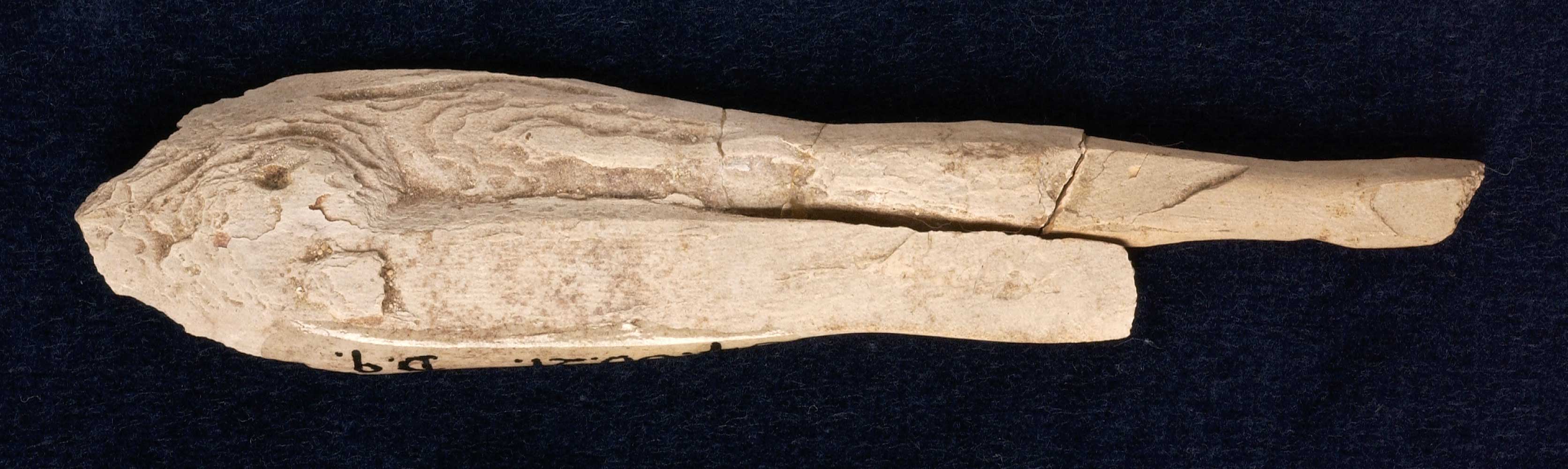 Abdomen and part of legs of female figure from a swimming girl cosmetic container. Navel shown, legs together. One leg remains to the knee and the other to the foot. Partly broken away at front and much broken away at back.