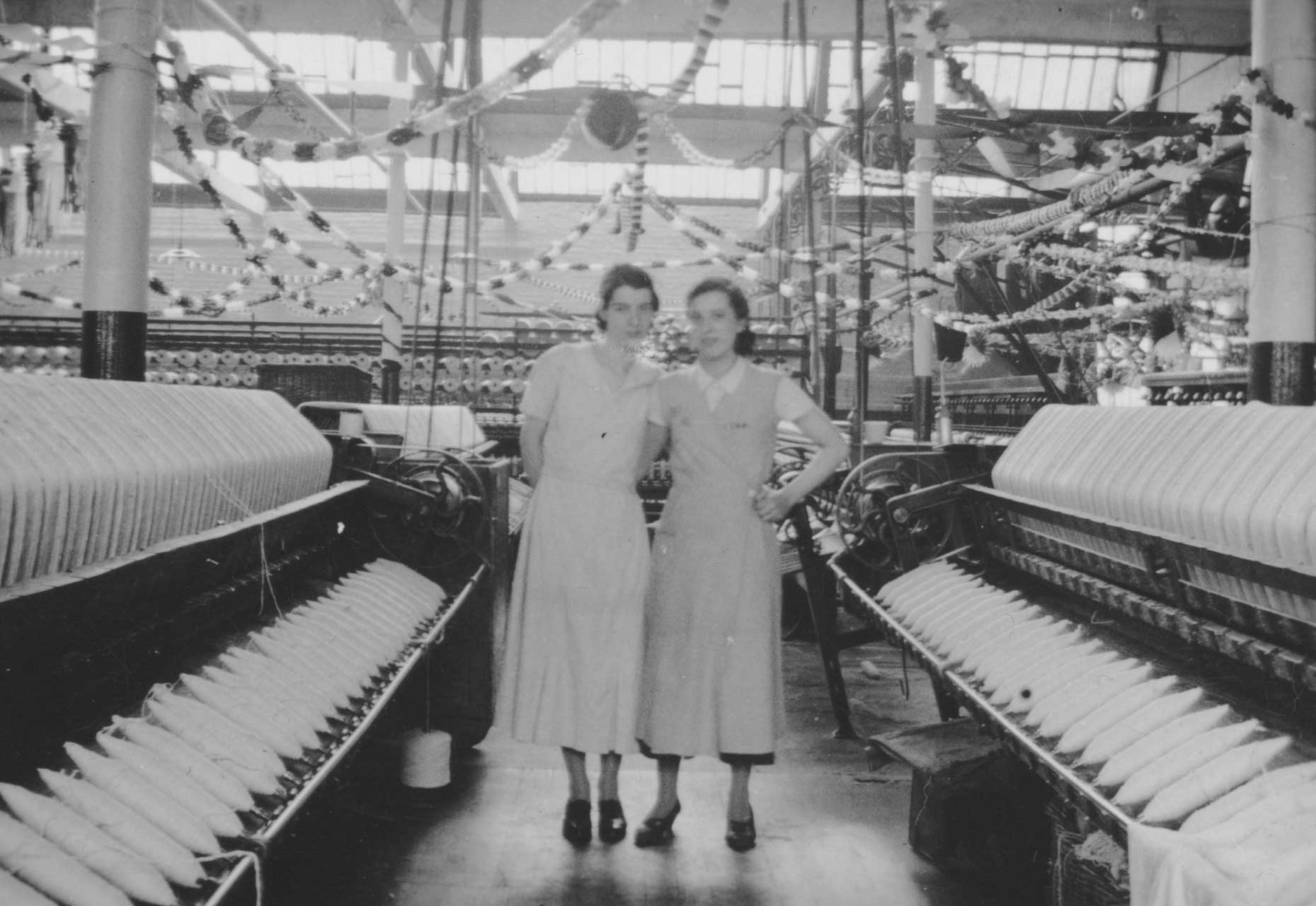 Black and white photo, taken 1937, of female staff of Barlow and Jones, Albert mills, Bolton, at time of coronation of King George VI and Queen Elizabeth. Mules to left and right, bunting and flags in background.